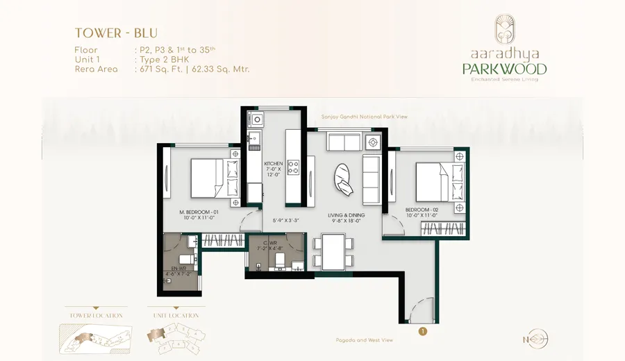 2 BHK – 2 Bedrooms, 2 Bathrooms, Living Room, Kitchen